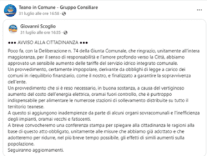 Il (S)indaco di Teano, in data 31 luglio 2024, alle ore 16,35, utilizzando un Canale Facebook intestato ad un Gruppo Partitico “Teano in Comune – Gruppo Consiliare” emana un Avviso alla Cittadinanza. Si dovrebbe presumere che essendo un Gruppo Partitico, annunci una riunione di partito per esporre le proprie opinioni sull’Autonomia Differenziata, sul Premierato o sulla partecipazione di “maschi/femmine” ad un incontro di pugilato categoria donne. No!