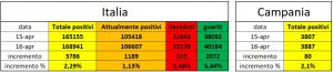 Cresce in Italia il numero di nuovi casi da coronavirus nel giorno in cui si registra un numero record di tamponi (61mila in 24 ore): i malati sono 3.786 in più contro i +2.667 di ieri, mentre diminuiscono i ricoverati in terapia intensiva, scesi per la prima volta dal 20 marzo sotto quota 3mila. Siamo a 2.963, 143 in meno rispetto a ieri. Tra i 106.607 malati 26.893 sono ricoverati con sintomi (-750).