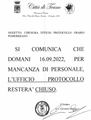 Una Casa Comunale dove ci si permette, con dispregio di ogni normativa dello Stato, di chiudere persino il Protocollo, con formale dichiarazione del Sindaco, ebbene, non c’è nemmeno bisogno di attendere l’ufficialità del Dissesto Finanziario, per chiudere i portoni ed andare tutti a casa. Protocollo chiuso? Ma ci si rende conto di quello che si fa? Un Cittadino residente fuori regione, viene a Teano per protocollare una documentazione urgente, che fa? trova il Protocollo chiuso? Ma qui si stanno dando i numeri!02 D’altronde come meravigliarsi se al Comune di Teano si è battuto il record dei tuttologi? Dove esiste un’Area che comprende gli Affari Generali, gli Affari Legali, e l’Ufficio Relazioni con il Pubblico. Un vero e proprio minestrone omnicomprensivo e, peraltro, omni improduttivo. Basti vedere il Sito Web istituzionale perfettamente sostituito dall’Ufficio Facebook al quale, tra non molto aggiungeremo quelli di Instagram e Tik Tok. Quindi, riassumendo, i funghi non si possono raccogliere, Via Rio Persico non è transitabile, l’Ufficio Protocollo è chiuso, il Sito Web è sottoposto (?) a lavori di restyling, l’Ufficio Relazioni con il Pubblico è “curato” dal Segretario Comunale, le scuole si chiudono misteriosamente da sole e riaprono alla bisogna, rimane funzionante solo l’Ufficio stipendi per gli (A)amministratori, i quali, a questo, punto ci si chiede ma cosa stanno amministrando? “Mo beco io”, gridavano i salvatori della patria….