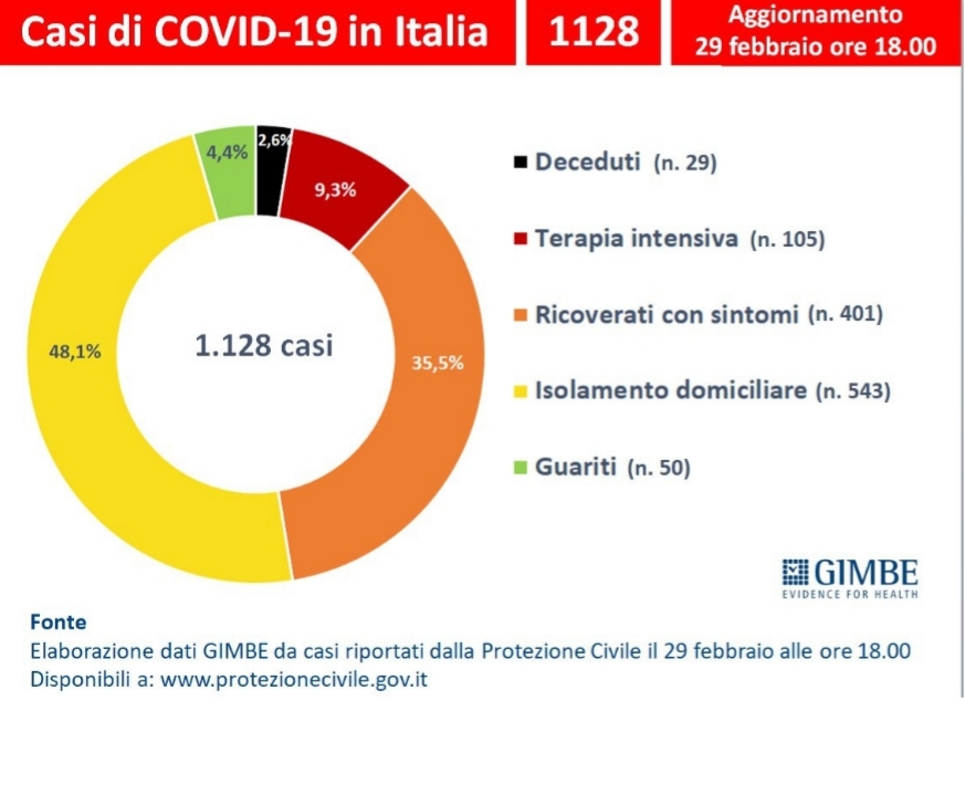 Nella giornata di mercoledì sono stati confermati i primi due casi di COVID-19 nella Regione Campania. Ne ha dato notizia in conferenza stampa il governatore De Luca, confermando come dal centro di malattie infettive dello Spallanzani di Roma i successivi controlli abbiano dato esito positivo. Non c’è comunque bisogno di allarmarsi, in quanto le due donne contagiate (una ragazza di Caserta e una donna di Battipaglia, entrambe provenienti dalla Lombardia) sono state prontamente poste in quarantena domiciliare e non risultino sintomatiche. Inoltre, si segnalano, 9 nuovi casi a Napoli città, 1 a Mondragone e 1 a Benevento, tutti confermati con esito positivo dall’Ospedale Cotugno di Napoli, centro di riferimento per l’analisi dei sospetti casi da Coronavirus in Campania. Non trova per ora conferme il sospetto caso di una donna di Sparanise giunta Sabato mattina al pronto soccorso dell’ospedale San Rocco di Sessa Aurunca. Nel resto d’Italia, la situazione è sotto controllo e sta velocemente rientrando alla normalità, nell’urgenza di limitare danni economici a imprese e industrie soprattutto nelle regioni settentrionali, le più colpite dall’attuale emergenza sanitaria. Qui di seguito, una grafica redatta dall’istituto GIMBE riguardo i casi accertati da COVID-19 in Italia e la loro attuale situazione: