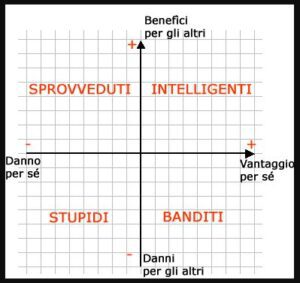 Noi umili mortali, che non siamo nulla in confronto ai personaggi sopra citati, genio della lampada incluso, ci rifacciamo in modo più grezzo ma pratico, ad un libro di Carlo M. Cipolla, uno storico italiano specializzato in storia economica che ha insegnato in Italia e negli Stati Uniti: Le leggi fondamentali della stupidità umana. Il Libro pone l’attenzione sulla stupidità umana con 4 leggi fondamentali ed un grafico: