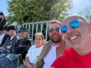 Una volta raggiunto lo stadio di Carinola, una 50 di tifosi teanesi si sono accomodati tranquillamente nel settore dedicato ai tifosi di casa, come dimostrato dalla foto che mi vede immortalato insieme a mio figlio, mio zio e mio cugino.