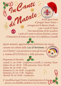 Il MASCI mettendo in pratica l’amore per il prossimo, nella tradizionale “Buona Azione” quotidiana, sarà ambasciatore di speranza. Unitamente alla fiamma della luce della pace, porteranno le melodie dei canti tradizionali del Natale, suonate con ciaramella, organetto e zampogna. Il tutto, per inondare di magia le strade di Teano e delle sue incantevoli frazioni.