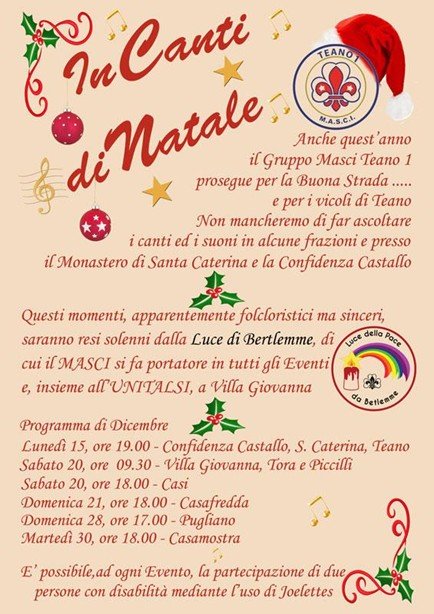Con un post dalla propria pagina FB, la Comunità MASCI del Teano 1 ha annunciato InCanti di Natale, la sua ennesima attività sul territorio. Per la prima volta, la Luce di Betlemme arriverà direttamente nelle nostre frazioni, e non solo, portando con sé un messaggio di pace, speranza e fraternità.