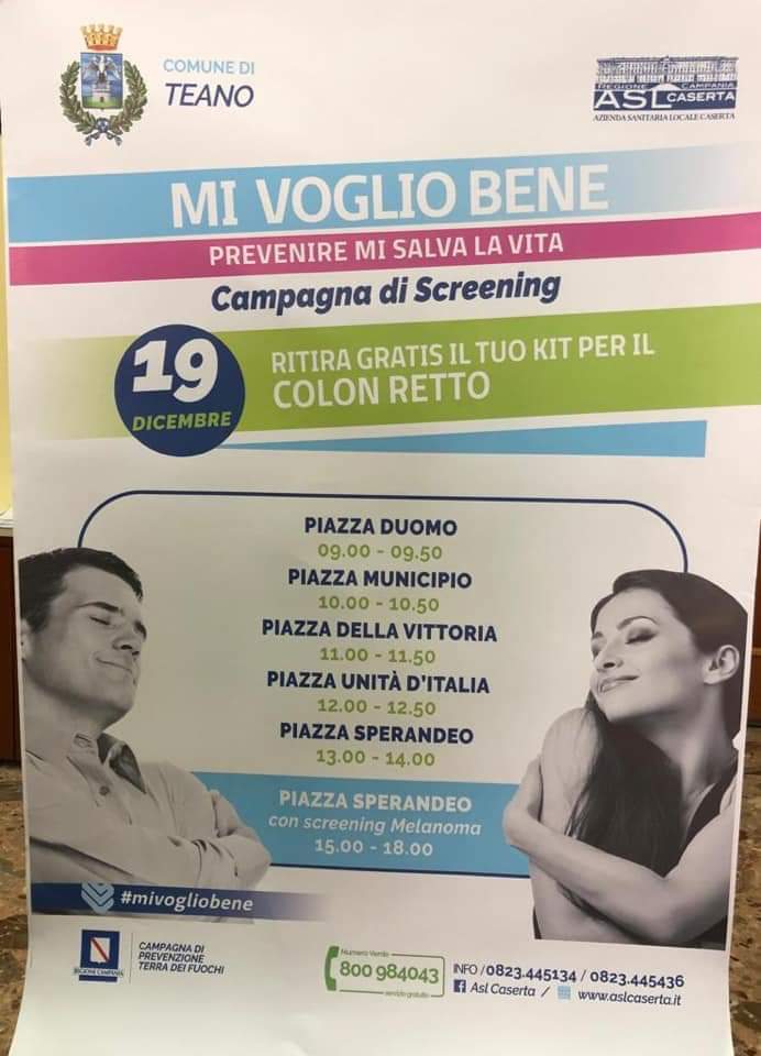 Mi voglio bene” è la campagna di screening promossa dall’ Asl Caserta. Il 19 dicembre il camper dell’Asl sarà presente anche a Teano. In mattinata per la prevenzione delle malattie intestinali, infatti sarà possibile ritirare gratuitamente il kit per il colon retto. Nel pomeriggio dalle ore 15.00 il camper dell’Asl sarà presente in piazza Sperandeo per la prevenzione del melanoma dove ci sarà anche lo staff del dr. Dino D’Andrea che, nei casi necessari, farà ecografie cutanee gratuite, con una sonda ad alta risoluzione, per lo studio della pelle.