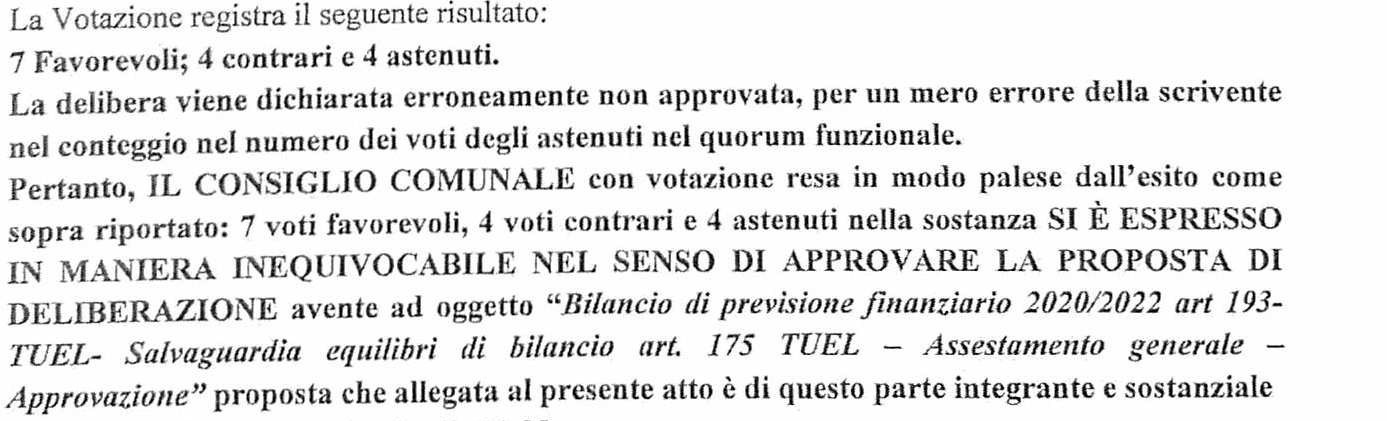 La narrazione di cui sopra non corrisponde a quanto accaduto all’esito della votazione. Infatti, a differenza di quanto ivi annotato, la Segretaria e la Vice Presidente del Consiglio, dopo aver conteggiato e confermato il numero dei voti favorevoli, contrari e degli astenuti volontari, hanno dichiarato che la proposta dell’Amministrazione non era stata approvata per non aver raggiunto il totale degli otto voti, pari alla metà più uno dei consiglieri presenti, e hanno confermato tale epilogo anche dopo le perplessità espresse da qualche Consigliere comunale. Nel corso dei lavori del Consiglio comunale né il Segretario né il Vice Presidente hanno mai dichiarato e comunicato alcunché – circa l’eventuale “errore” commesso – ai Consiglieri presenti alla seduta assembleare. Prova ne sia che gli stessi Consiglieri che avevano votato favorevolmente alla proposta deliberativa in discussione si sono poi alzati dai loro scranni e si sono allontanati definitivamente dall’aula consiliare. In realtà, tutto quello che è stato spacciato per fatti verbalizzati sono invece riferiti a documenti e atti postumi. Infatti solo con le note prot. n. 1896 R.E. del 01/12/2020 a firma del Vice- Presidente del Consiglio e prot. n.15215 del 02/12/2020 a firma della dott.ssa Teresa De Rosa Segretaria verbalizzante dei lavori consiliari in argomento, è stato comunicato ai Consiglieri comunali il presunto errore commesso. A tal proposito ci appare utile ricordare che il verbale, quale atto giuridico annoverabile nella più ampia categoria degli atti certificativi, è un documento finalizzato alla descrizione di fatti compiuti alla presenza di un soggetto verbalizzante (ndr il Segretario comunale), al fine di garantire la certezza della descrizione degli accadimenti constatati; tale documento ha quindi l‘onere di attestare il compimento dei fatti svoltisi e deve costituire il fedele resoconto dell’andamento delle sedute consiliari. Ci appare evidente che per il caso di specie siano stati ampiamente violati tutti i predetti requisiti.